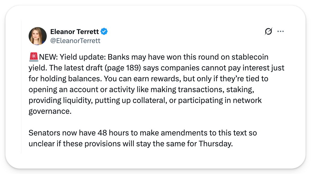 Coinbase – have surprisingly continued to back the bill's language on stablecoin yield prohibition, viewing it as the least favorable language they could tolerate without derailing the bill's momentum.