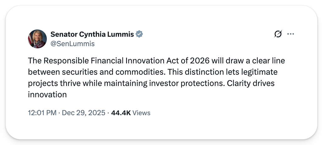 The Lummis-Gillibrand Responsible Financial Innovation Act of 2026 – Title I of DAMCA – would amend the Securities Act of 1933 to clarify when crypto network tokens transition from securities into commodities.