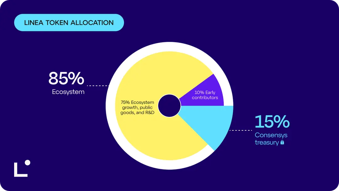 85% of the upcoming LINEA supply is slated for the ecosystem: 10% for early users and contributors, and 75% for "growth, public goods funding, and Ethereum R&D" via what Linea is billing as the largest ecosystem fund of its kind.