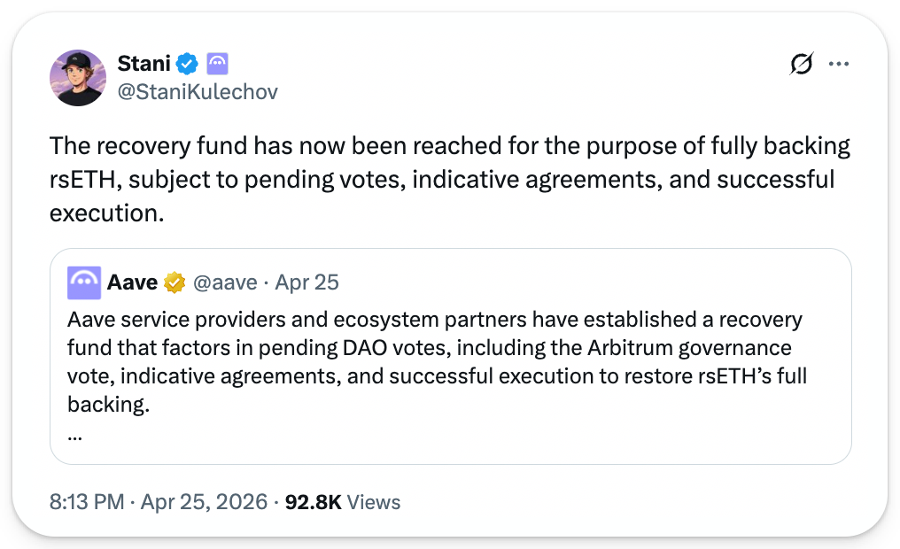 Although the early days that followed the KelpDAO KelpDAO exploit were indeed dark, with only $56M in WETH deposits stored in Aave’s staking module reserved against hundreds of millions of dollars in bad debt, the rsETH hole appears to have been plugged.