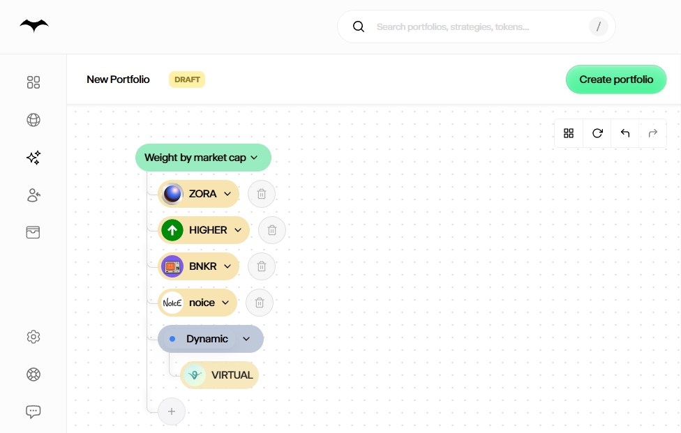 - Next up, you'll be asked to choose a starter portfolio. You can pick from the 3 presets: "50/50 BTC and ETH," "DeFi Token Mix" (AERO, MORPHO, PENDLE, WELL), or "The Big Five" (BTC, ETH, DOGE, XRP, SOL). Alternatively, you can scroll down and select the "Create My Own" option to immediately dive into a customized portfolio.