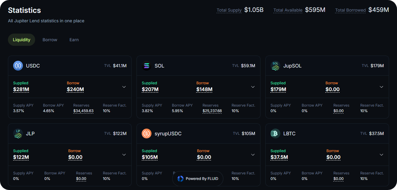 This page provides a one-stop overview of all Jupiter Lend's current activity, like TVL levels, supply APYs, borrow APYs, etc. You can flick through the "Liquidity," "Borrow," and "Earn" tabs to analyze and find opportunities that suit you.