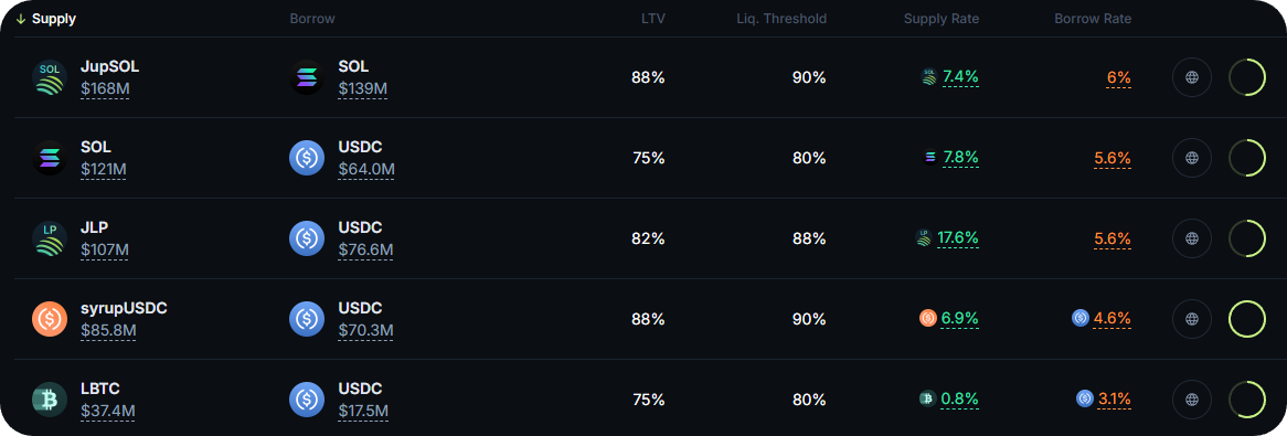 This is where Jupiter Lend uses isolated vaults and its new liquidation engine to facilitate onchain borrow positions. Here, you'll find pairs of supply assets and borrow assets, like SOL + USDC, LBTC + USDC, etc.