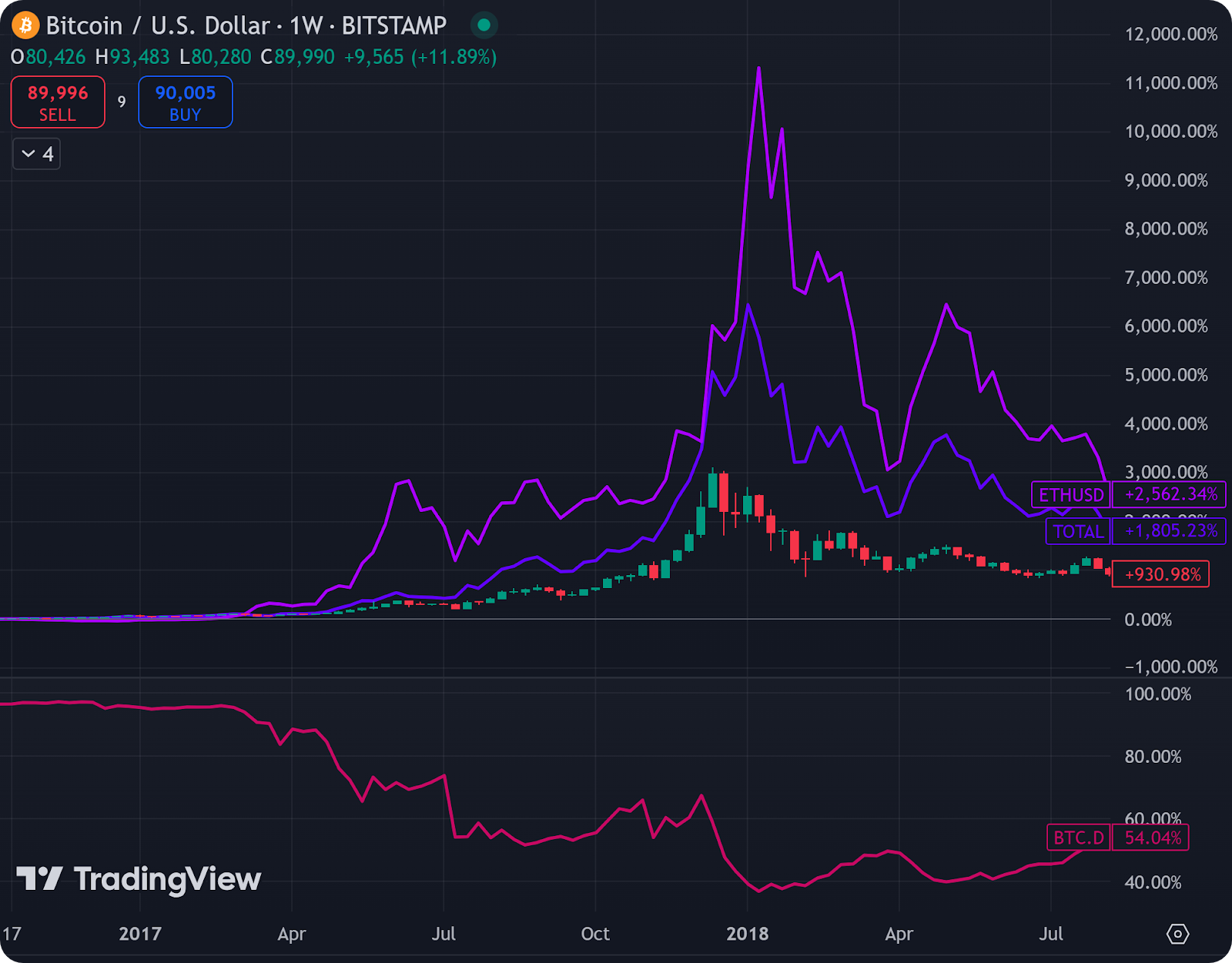 With the Trump Administration’s blind eye to boot, crypto appears poised for a period of bliss reminiscent to the ICO Mania heydays of 2017, when BTC dominance fell as unfettered optimism indiscriminately lifted everything and anything to irrational prices.