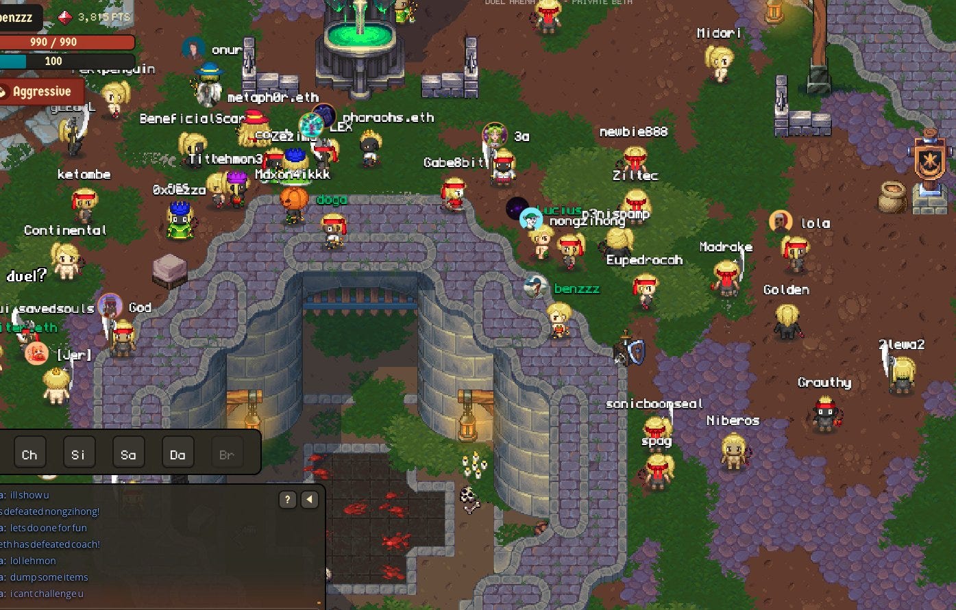 Overview: Duel Arena is a game within a game, as it’s actually a mini-game within Cambria, a “Runescape-inspired game with onchain stakes.” The gist is straightforward: players stake ETH on Base in an onchain escrow system, and then duke it out 1-on-1 in an arena in a virtual fight to the death for that staked ETH. The game is live and playable today, and it’s seen a good bit of traction, as it’s already facilitated over $1M USD worth of ETH staked to back its duels.