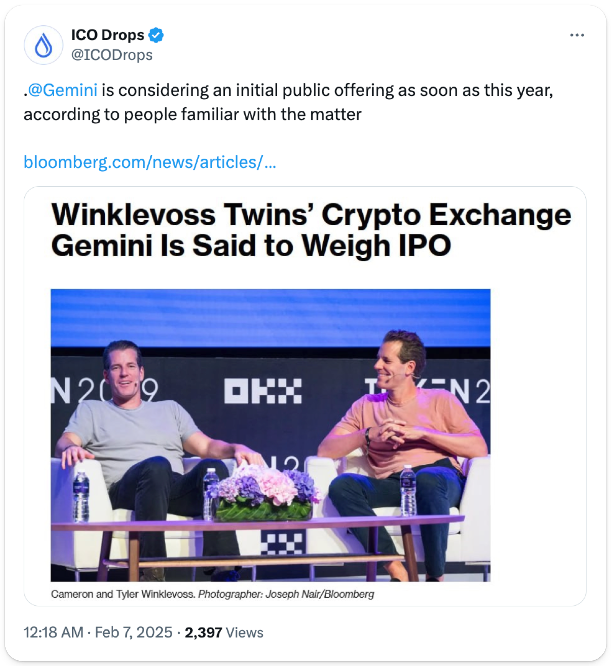 Gemini, the crypto exchange led by the Winklevoss twins, is considering going public as early as this year. Sources tell Bloomberg that the crypto firm is talking with advisors about a potential listing. While the crypto market has not sustained the pace of its post-election euphoria, it is no surprise to see crypto firms like Gemini and