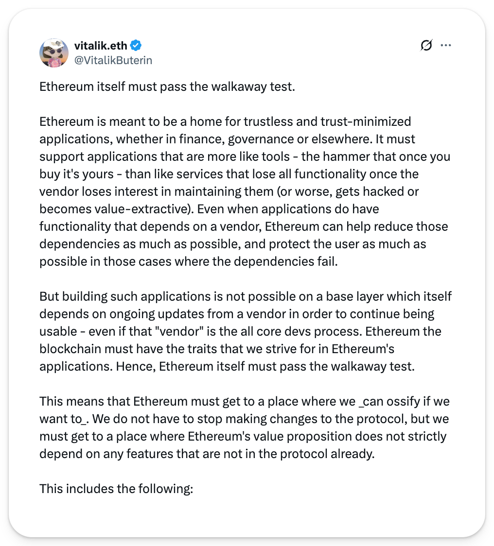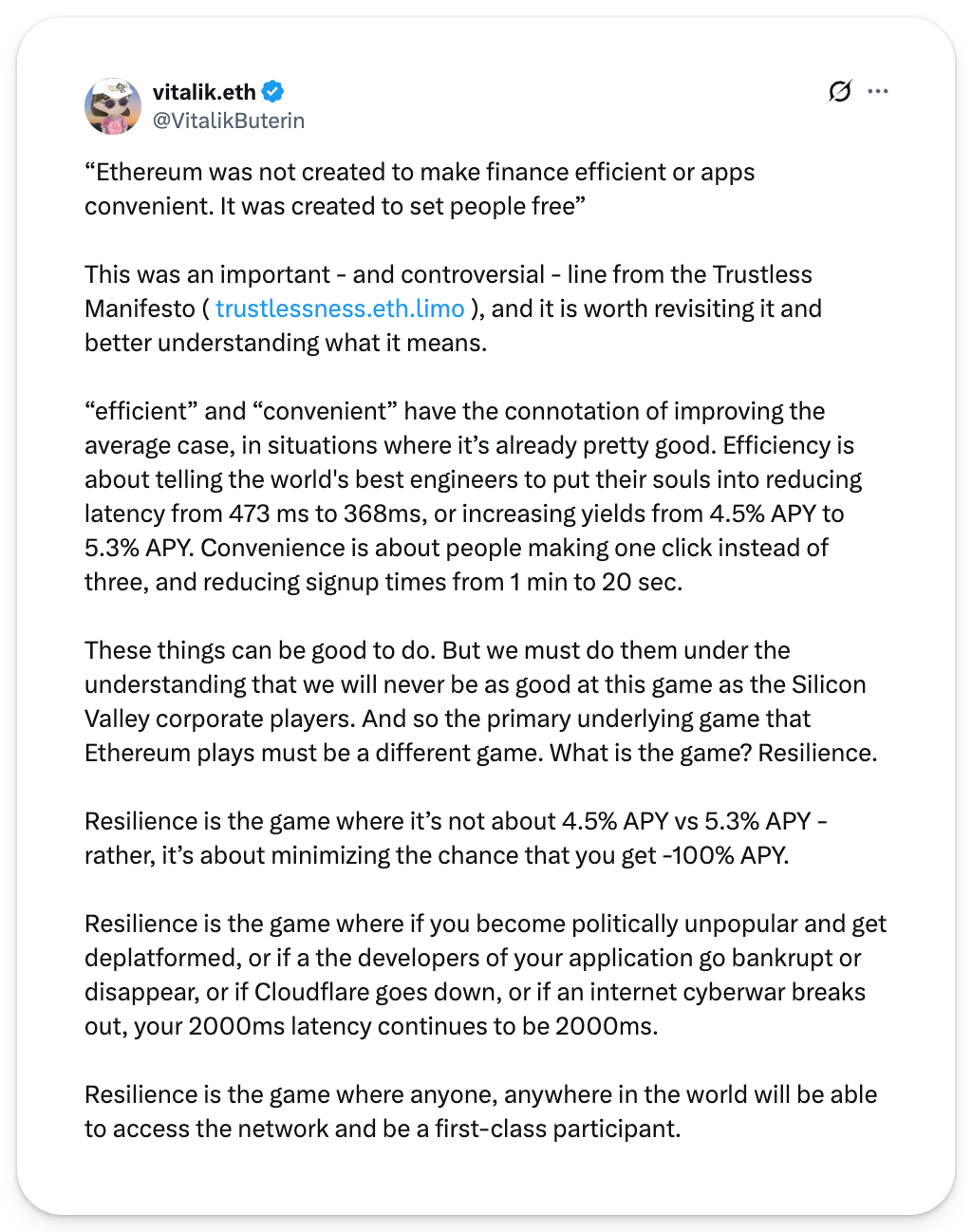 Vitalik's recent posts are only the latest reminders that resilience, trustlessness, and scale are not just marketing slogans for Ethereum.