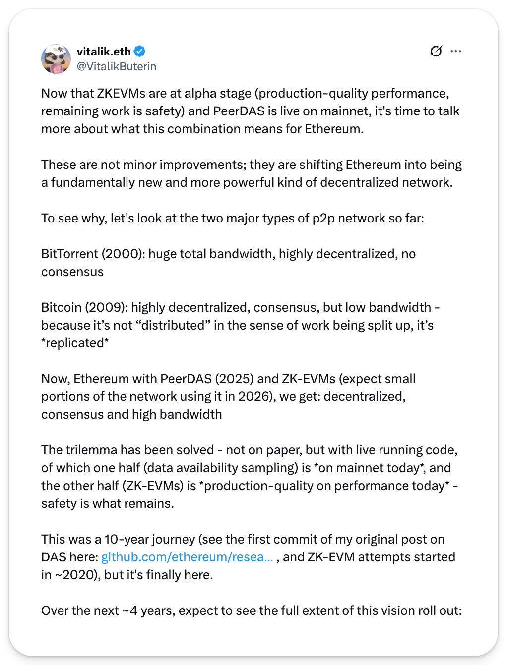 Over the next four years, Vitalik anticipates that Ethereum will become the first network to fully conquer the blockchain trilemma thanks to PeerDAS and zkEVMs, offering a model where security, decentralization, and scalability reinforce one another instead of competing.
