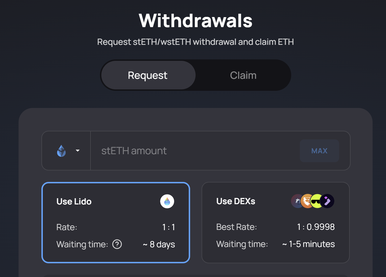 Lido — which controls 24% of all ETH staked — yields stETH, a fungible deposit receipt that can be swapped instantly at market prices or redeemed over a period of days at a 1:1 ratio for ETH. Whether swapping or redeeming, stETH holders typically receive stronger execution than alternatives thanks to its deeper liquidity and larger validator base — factors that enhance swap pricing and speed up redemptions.