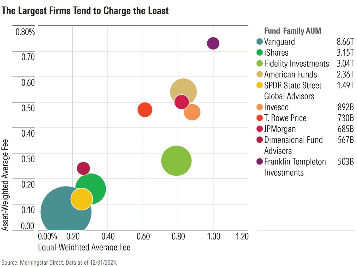 Vanguard’s success shows up clearly in the numbers, and today the asset-management landscape is ruled by low-cost passive indexers! The chart below shows an unmistakable link between lower fees and larger assets under management.