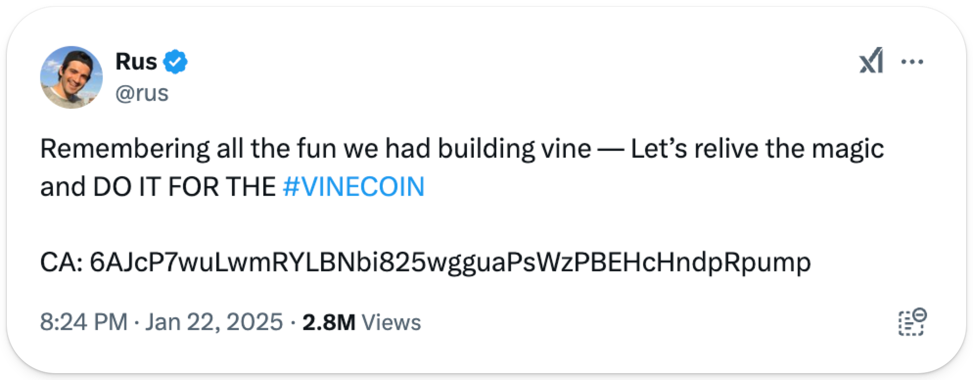 In a blast from the past, two projects revived older internet icons to take CT by storm. First up is VINE, launched by Vine co-founder Rus Yusupov to “commemorate” the short-form video platform. The token soared to a $500M market cap on day one before settling nearer to $200M, with Yusupov pledging to lock dev tokens until April.