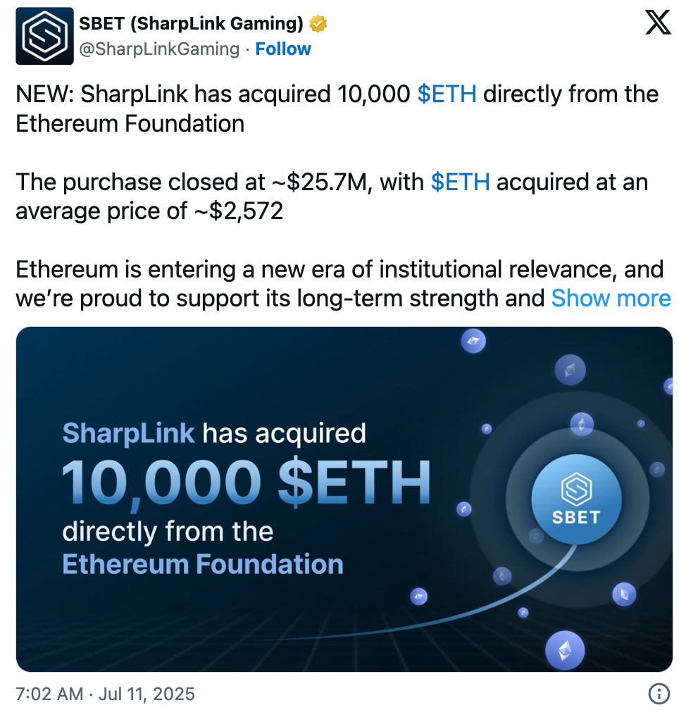 Ethereum treasury company, Sharplink Gaming (SBET), announced on Friday that it had purchased 10k ETH directly from the Ethereum Foundation for $25.7M at an average price of approximately $2,572 per coin. Separately, a non-profit Ethereum Foundation spin-off also offloaded 1,210 ETH for $3.5M this week.