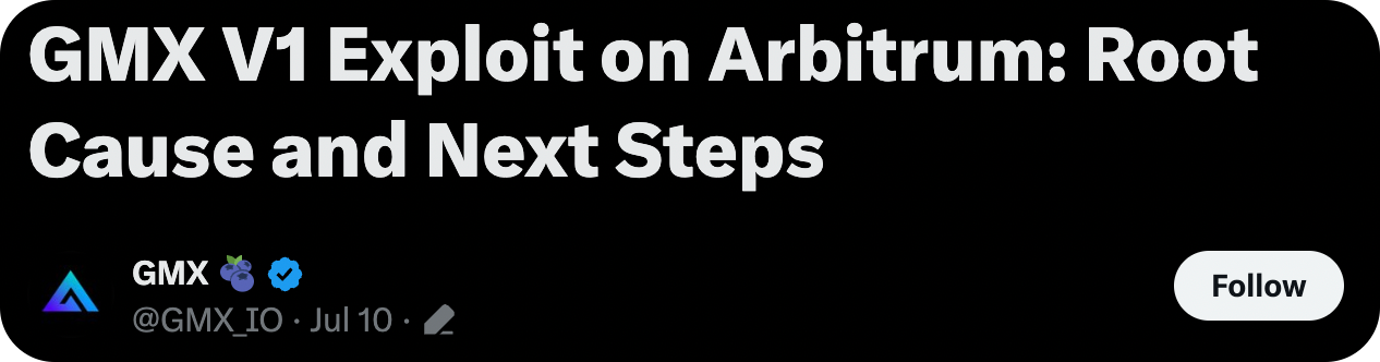 In exchange for the safe return of funds, GMX promised a $5M bug bounty and to not pursue legal action. The unknown exploiter accepted this offer on Friday, and the GMX Treasury has committed to covering the remaining GLP shortfall net of the bounty.