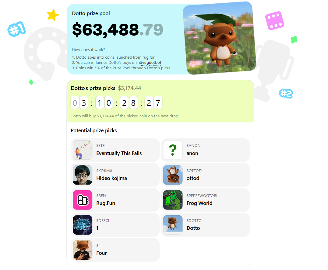 As for Dotto, this is the app's native AI agent, created to amplify the most promising tokens launched on rug.fun. Both an evaluator and a participant, Dotto analyzes social engagement and then selects one standout coin per week from the pool of successfully launched tokens.