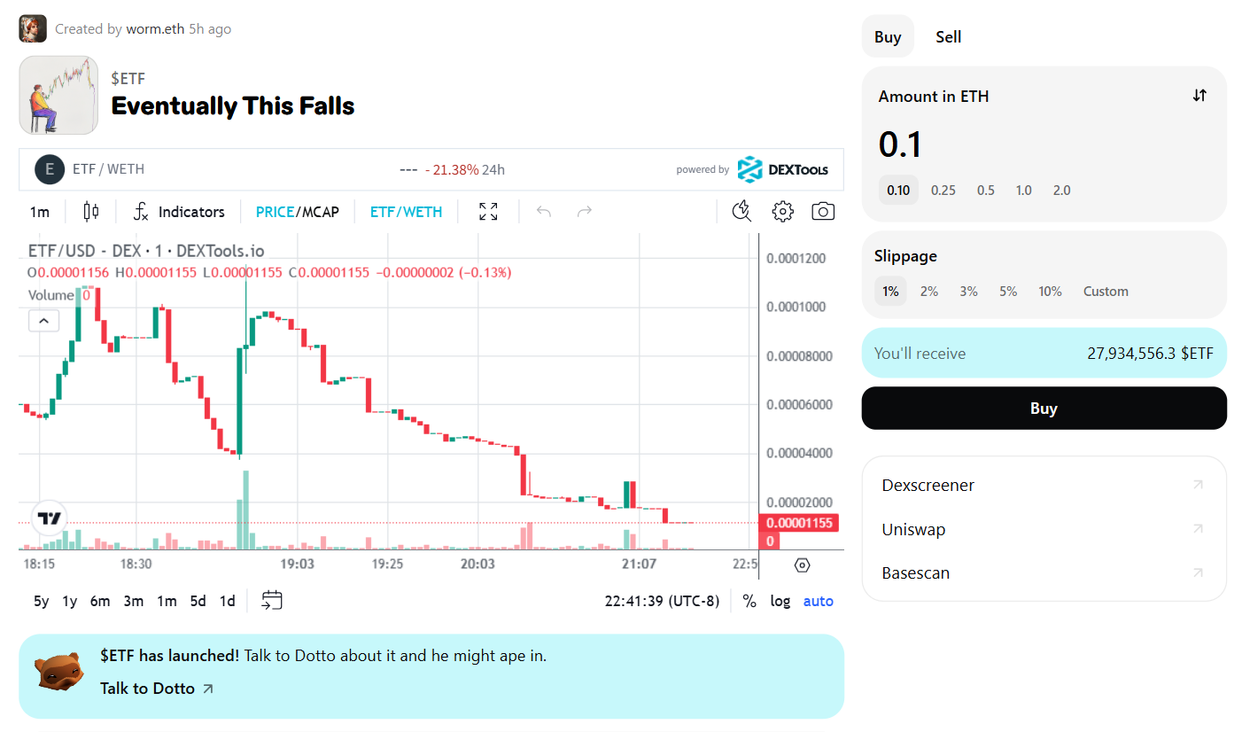 Here you'll also find "Buy" and "Sell" interfaces, which work atop the underlying rug.fun protocol or atop Uniswap V3 in the case of successfully launched tokens. Use these widgets to manage your positions. Other helpful links like Dexscreener and Basescan let you analyze related trading action in depth as you're surfing around.