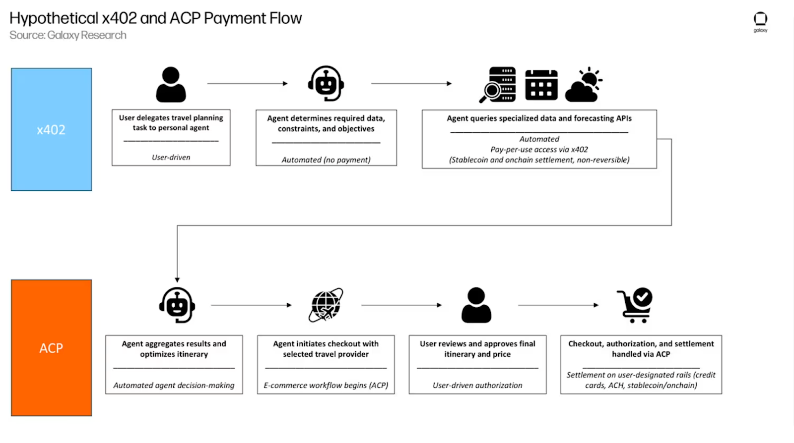 But, imagine an AI agent tasked with planning a vacation on your behalf (as Galaxy Research does). First, the agent may need intelligence: optimal travel dates, weather patterns, airfare volatility. To get this, it could query specialized data providers — a premium forecasting service, a demand-prediction API — that have integrated x402. Via the protocol, the agent programmatically discovers pricing, pays for access, and retrieves data.