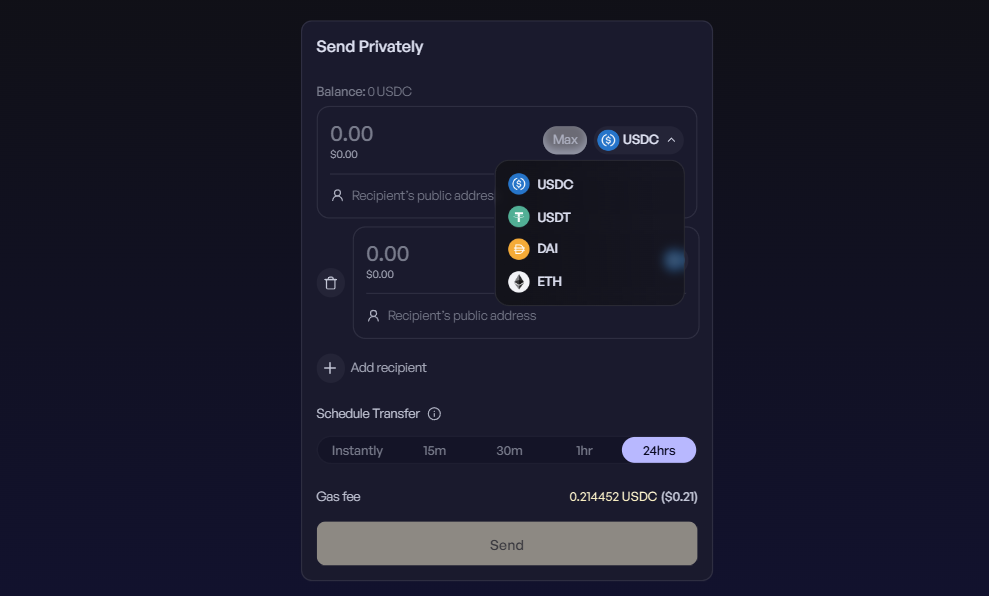 - Crucially, this all feels like a standard send from the user’s point of view, except you have some bonus features here, like the ability to split payments across multiple recipients or to set a specific transaction execution window for randomizing a send's timing.