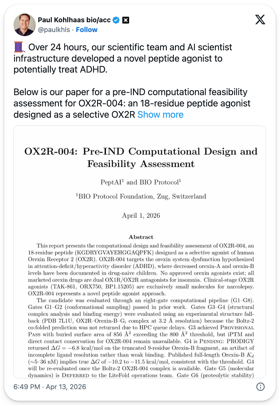 In other words, with discovery costs collapsing, a DAO treasury can now fund a candidate all the way to the point where real lab data exists. That puts entire categories of research within reach that pharma was never going to touch. The biology behind ADHD's orexin system has been documented for years. No institution with the capital to develop a drug around it has chosen to do so. PeptAI did.