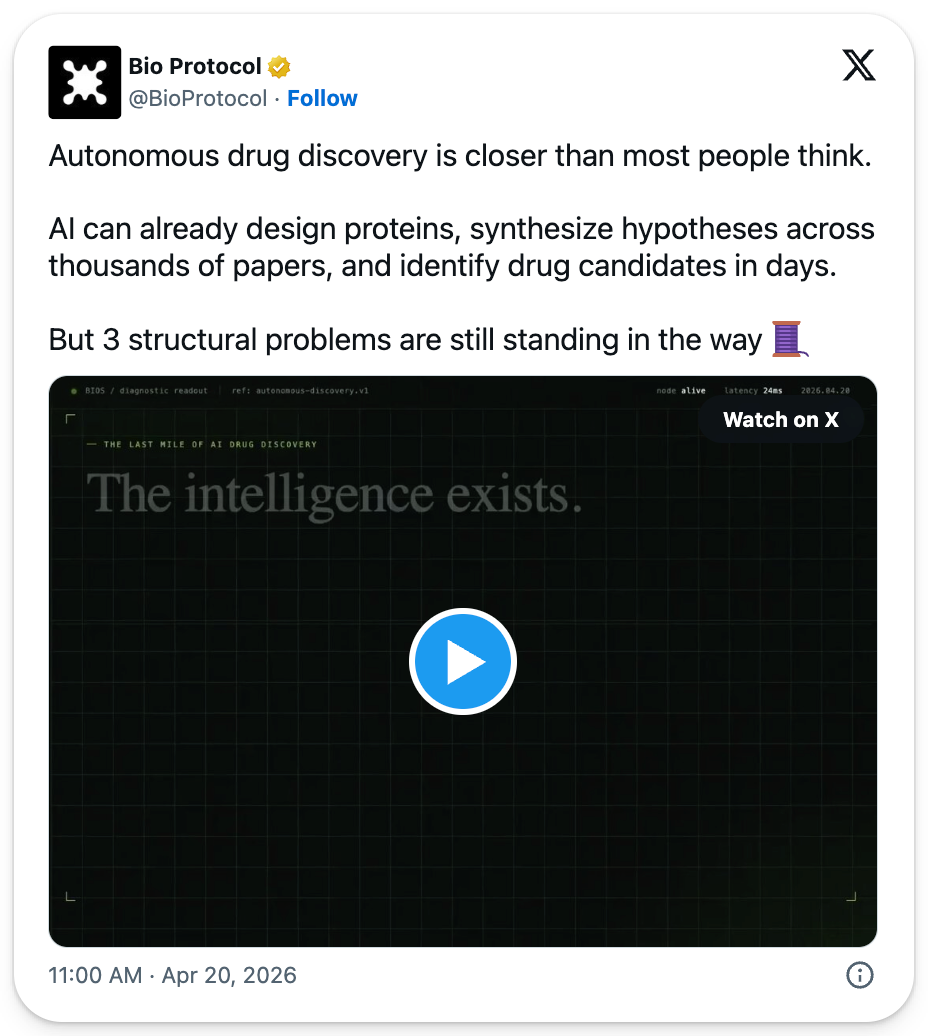 The point is that Bio Protocol is running both engines at once. Community fundraising and agentic science are incredibly synergistic: if AI can design candidates cheaply enough that communities can fund them directly, the earliest stage of drug discovery stops depending on institutional gatekeeping.