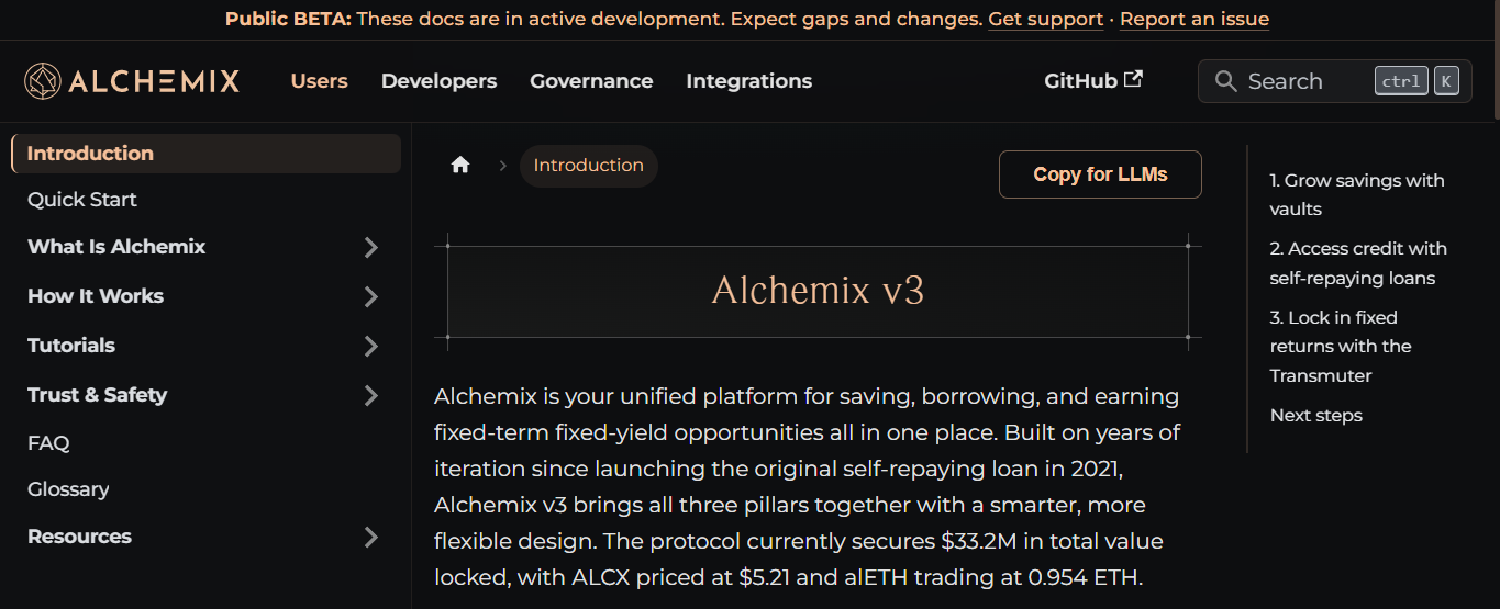 For instance, this week I've been checking out Alchemix V3, which offers self-repaying loans against ETH and USDC, so I was recently surfing through docs.alchemix.fi/user. This one has some great resources, and I say that as someone who has seen droves of subpar docs. Alchemix's hub gives you a total bird's-eye view of the protocol, plus explicit pages for Risk Considerations and Security & Audits.