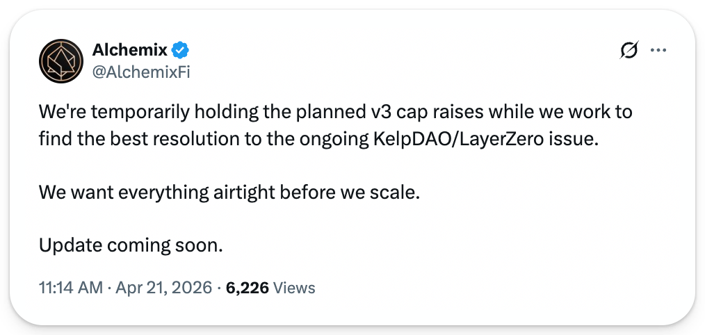For instance, Alchemix had originally planned to lift its initial V3 deposit caps on April 20, but in the wake of the Kelp DAO exploit and in anticipation of more clarity around that incident (which has thankfully arrived), the project announced a pause on its cap-lifting plans. It wasn't an emergency that required action from users, but the post demonstrates that X is where you go to check for the latest updates and community discussions. Make a scan here before doing anything onchain just to be safe.