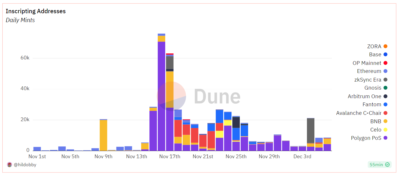 In the Ethereum ecosystem specifically, we’ve been seeing Inscriptions-style mints climb after the arrival of Ethscriptions in June 2023.