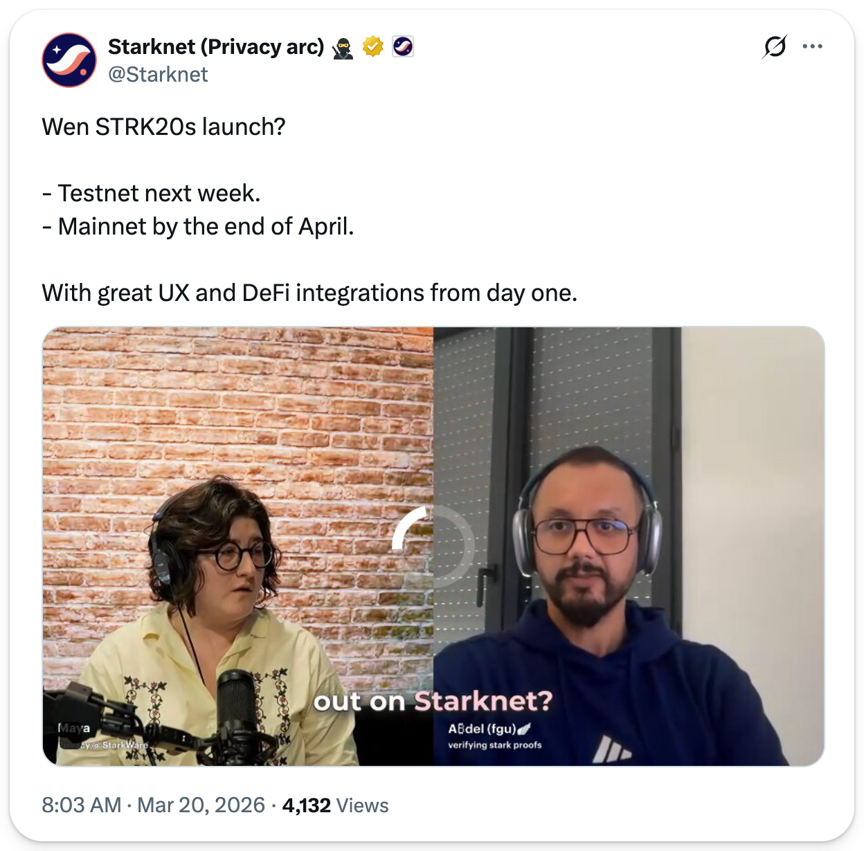 Big news as of today: Starknet shared that testnet goes live next week, with mainnet targeted for the end of April.
