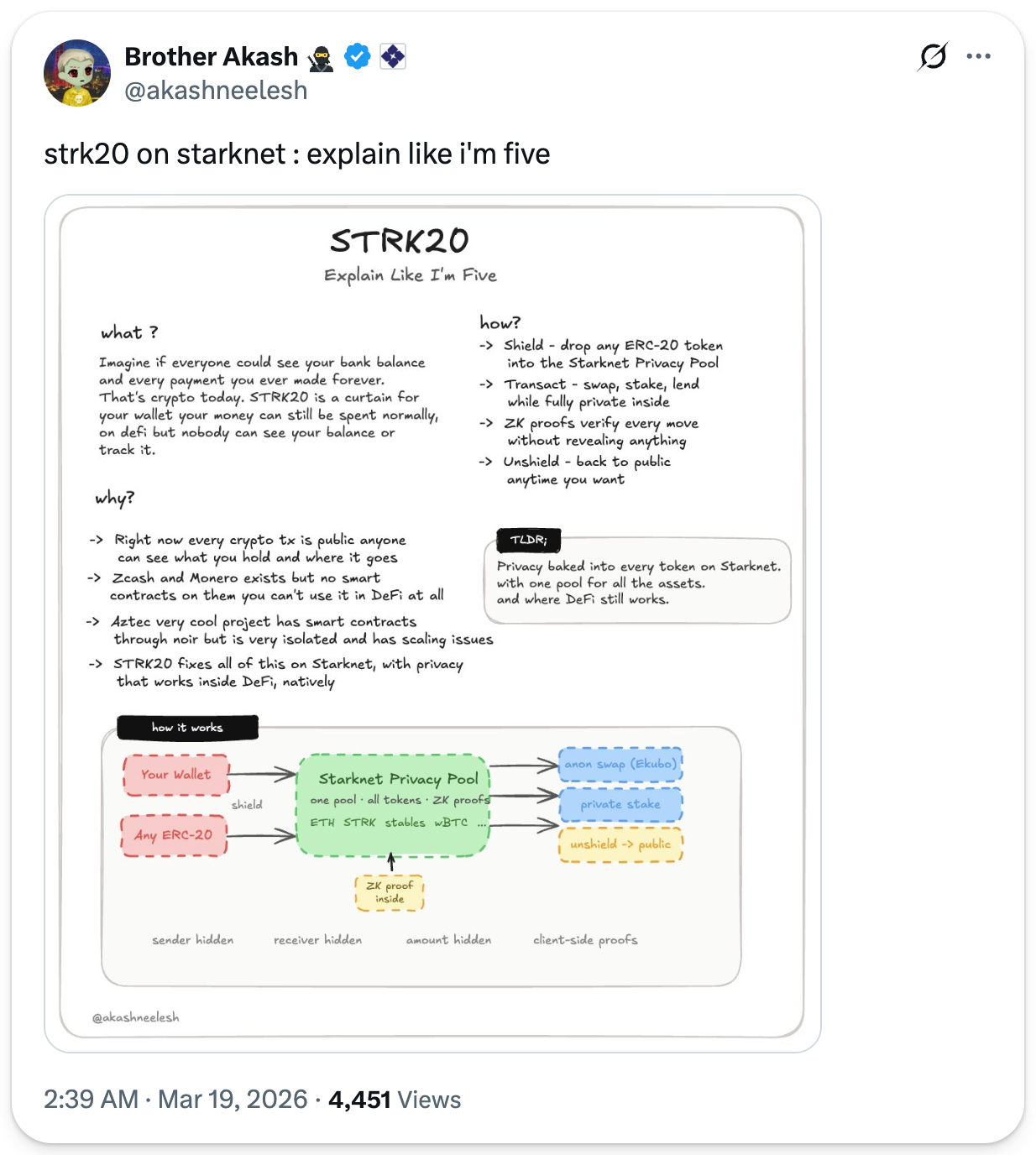 The flagship of this launch will be strkBTC, a similarly privacy-preserving version of BTC. STRK20 is the broader play: a standard for shielded tokens that still behave like normal crypto: composable with DeFi, usable at scale, and built with regulatory compliance from day one. Let me walk you through how it works.
