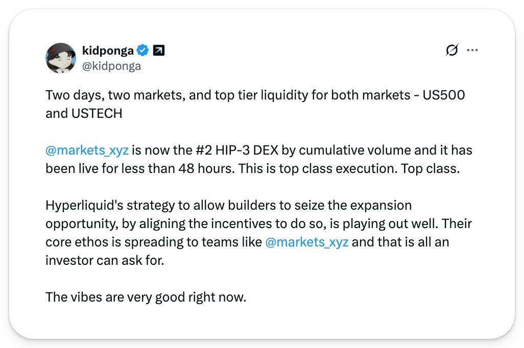 - Trade (from Unit) offers USDC-margined perps across stocks, indices, and commodities. It currently has the deepest liquidity among the three, making it the default choice for traders prioritizing tight spreads (the small difference between buy and sell prices) and minimal slippage (when the final trade price stays very close to the expected price). No points program has been announced, though given Unit's role in building out Hyperliquid's spot listings, many expect an eventual airdrop for active users.