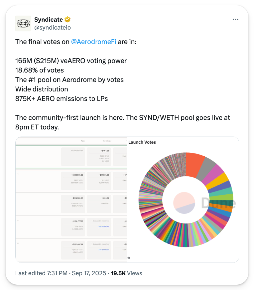 By leveraging freshly deployed SYND tokens as emission incentives, the Syndicate team managed to attract $215M of veAERO votes, representing 18.68% of voting power and granting SYND-WETH liquidity providers over 875k of AERO emissions for the next week.