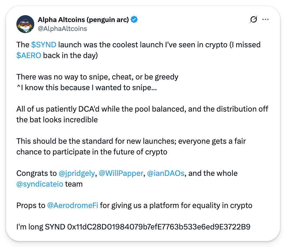 Billed as a “radically open, transparent, and decentralized model for launching a token that puts community at the center from day one,” the Syndicate token launch certainly rewarded veAERO holders. This group secured SYND allocations for their votes, which could be deployed to capture the artificially inflated liquidity provider yields they had voted to emit.