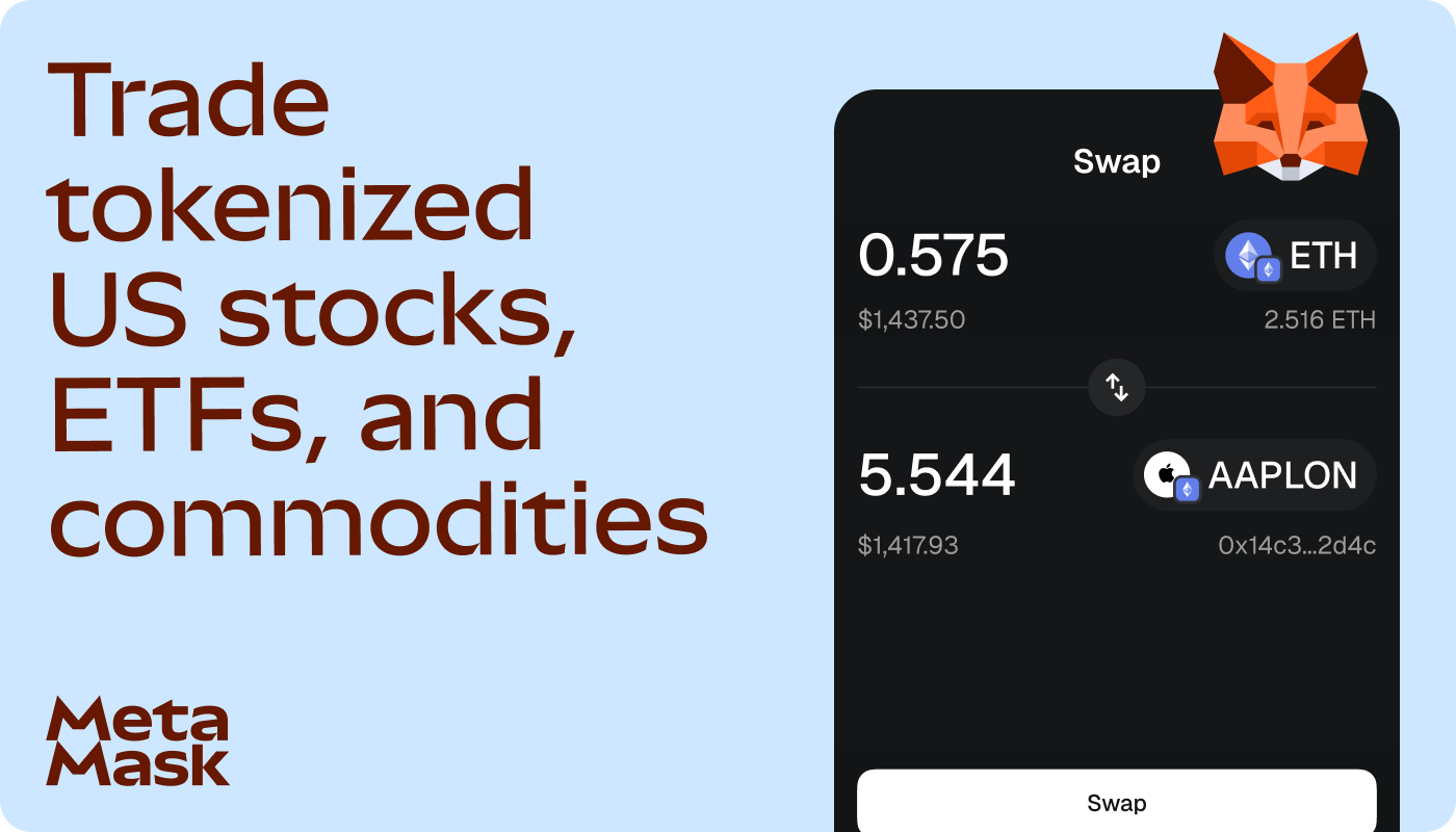 Trade 260+ tokenized US stocks, ETFs, and commodities—oil, S&P500, NVIDIA, gold, and more—right from your phone. No KYC, no brokers, total self-custody. Buy and sell RWAs on MetaMask, powered by Ondo Global Markets.