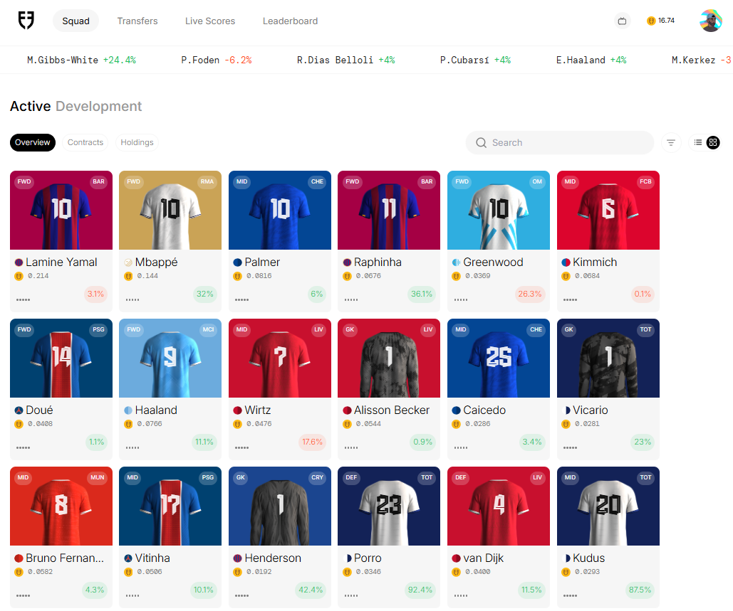 For instance, right now the players with the highest market caps on FDF are the best players in the world, like Lamine Yamal ($8.9M), Kylian Mbappé ($6.2M), and Harry Kane ($3.3M). Owning shares of these players is an active bet that they'll continue to perform well, both IRL and thus in FDF.