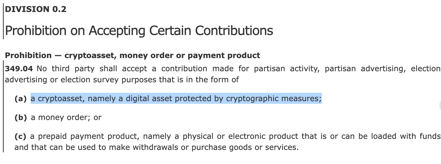 Canada is moving to ban crypto money in politics with Bill C-25, titled the Strong and Free Elections Act.