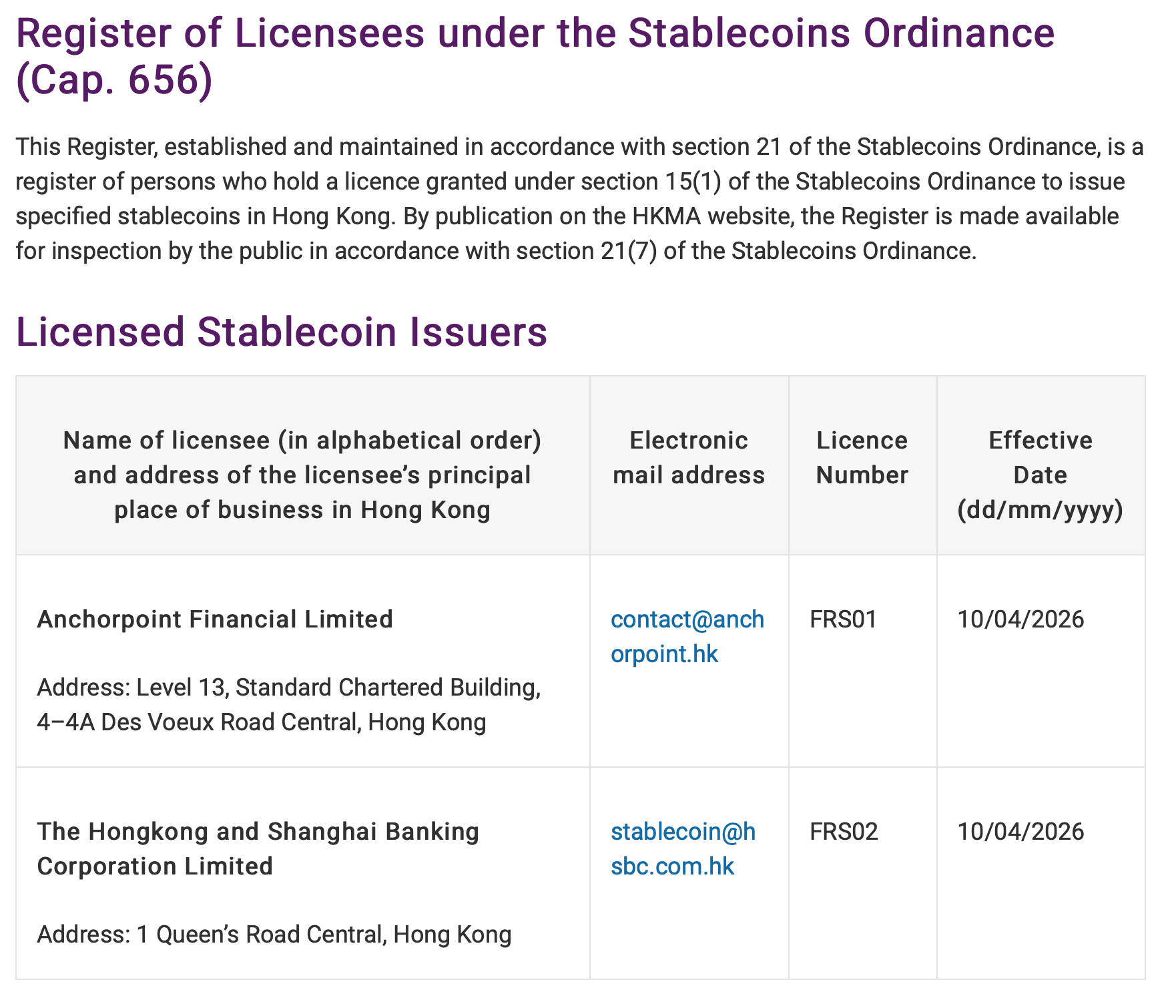 - Licensed Issuers: Hong Kong's central bank has granted stablecoin issuance licenses to HSBC, a leading global financial institution anchored in Hong Kong, and Anchorpoint Financial, a Standard Chartered-led joint venture with participation from crypto VC