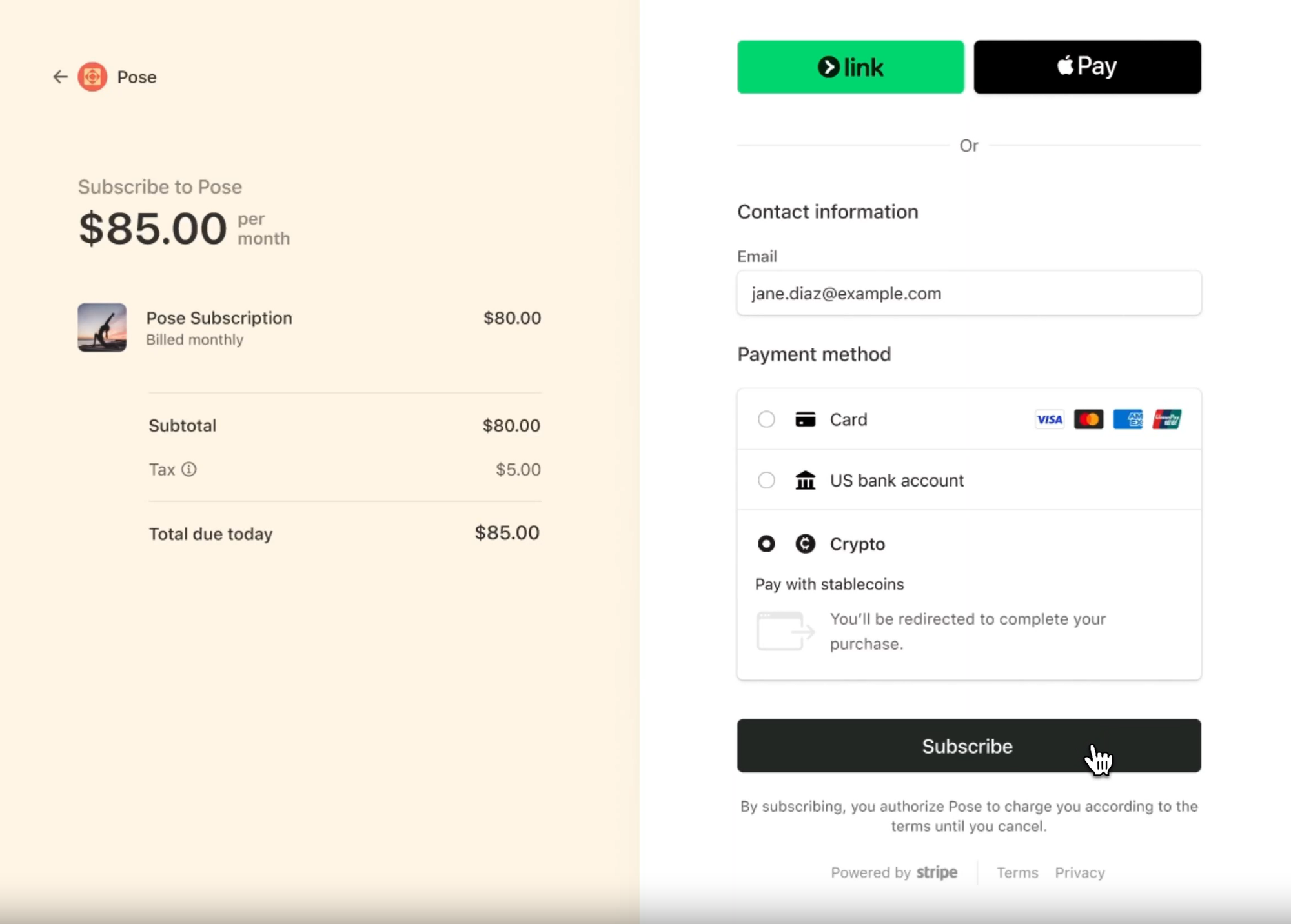 - Unified Dashboard Experience: Stablecoin subscriptions can be managed alongside fiat payments in the Stripe Dashboard, fully compatible with Stripe Billing and the Optimized Checkout Suite. This integration gives businesses a unified view of cash flows across both traditional and crypto rails.
