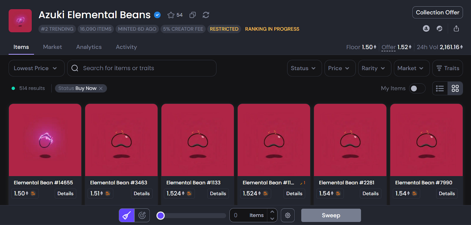 In the immediate aftermath of a big mint, fake lookalike collections can cause chaos in NFT marketplace search bars, so again, double check you’re on the correct collection page. For reference, here are the official OpenSea Pro pages for Azuki Elemental Beans (unrevealed) and Azuki Elementals (revealed).