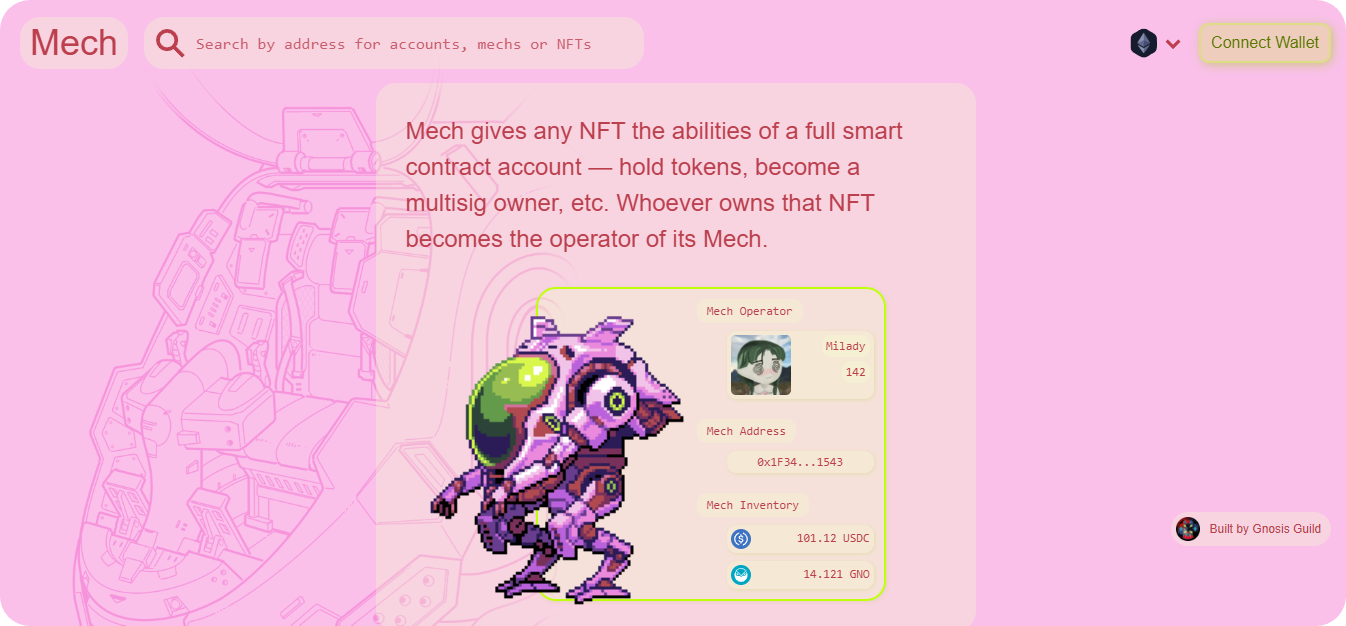 As such, a Mech can do anything anyone can do onchain, from making a basic swap to managing sophisticated DeFi positions. Ownership is flexible, too, as a Mech can be controlled by whoever holds a specific NFT or ERC-20.