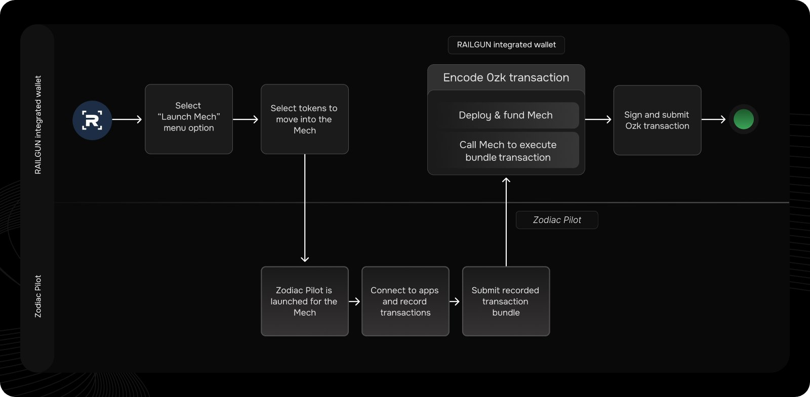 In other words, after you deposit unshielded tokens into your Mech, the Mech gets shielded into an 0zk address, and from there it can make calls via Zodiac Pilot (another Gnosis Guild tool) to a DeFi protocol like any regular address would.