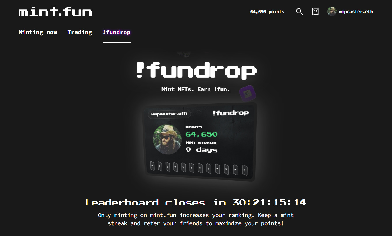 mint.fun just introduced !fundrop, a rewards system for NFT users. On the platform you can mint a free !fundrop pass, which then allows you to earn !fun points for minting NFTs on mint.fun. These points can be used to access rare reward boxes during upcoming rewards waves, with the first one scheduled for May 15, 2023. The !fundrop leaderboard will play a big role in determining these future rewards, so keep this on your radar going forward!