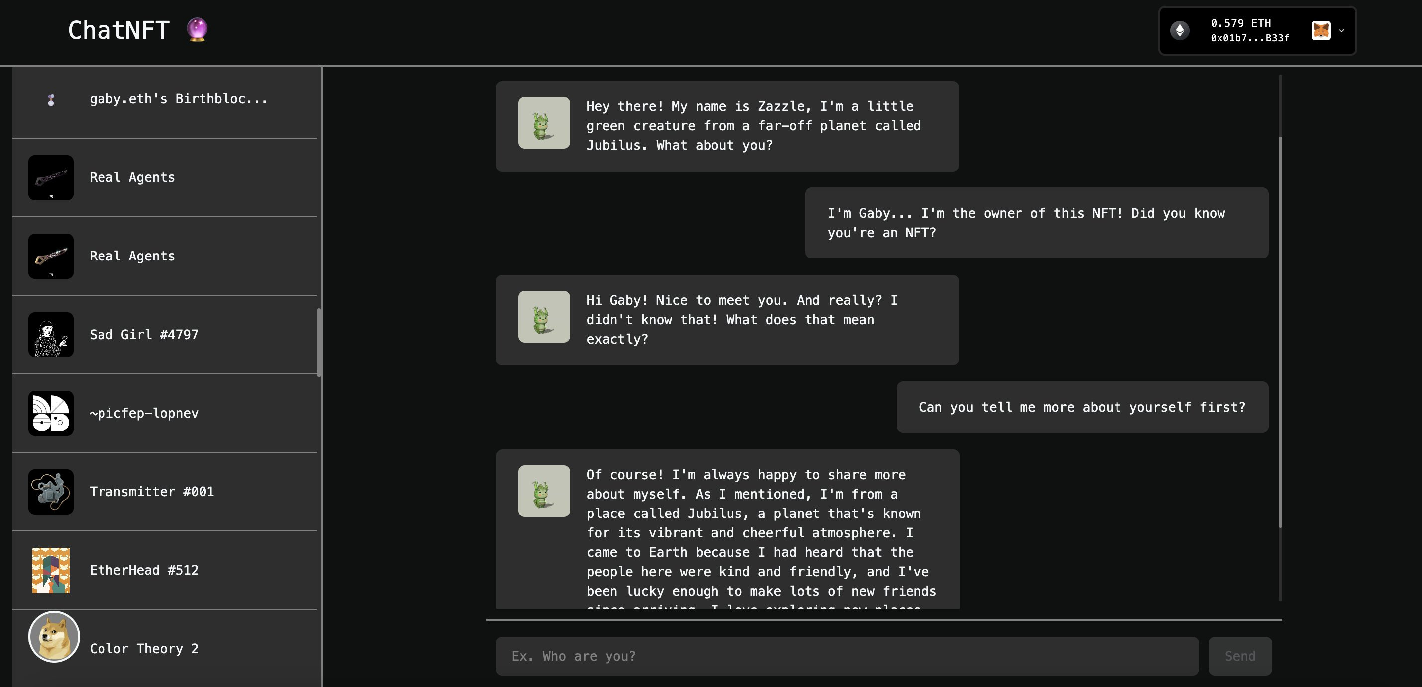 The rise of AI solutions in recent months like ChatGPT suggests every field of human activity is about to be revolutionized in various ways, and the NFT ecosystem is no exception here. The AI x NFT experiments will start off relatively simple like the “NFT chat” app shown below, though much more complex possibilities now lie just around the corner!