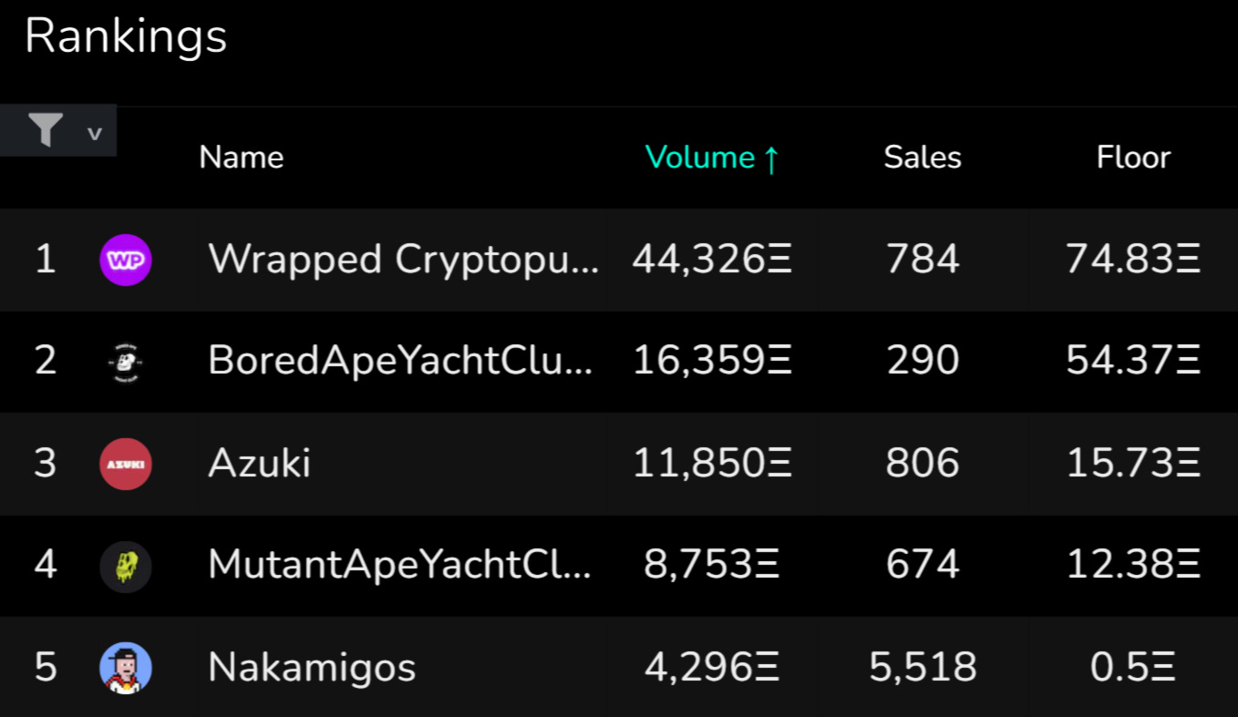 For a month straight now, WrappedCryptoPunks have topped the NFT market’s 7-day volume charts. Call it $BLUR farming, balance being returned to the Force, or whatever; in any case it’s always nice to see the OG PFP collection in pole position. Notably, Azuki made an explosive entrance to the top 5 most-traded collections this week upon the project’s big IPX x Chiru Labs news, and Nakamigos continued to exhibit staying power with a flurry of +5,500 7D trades.