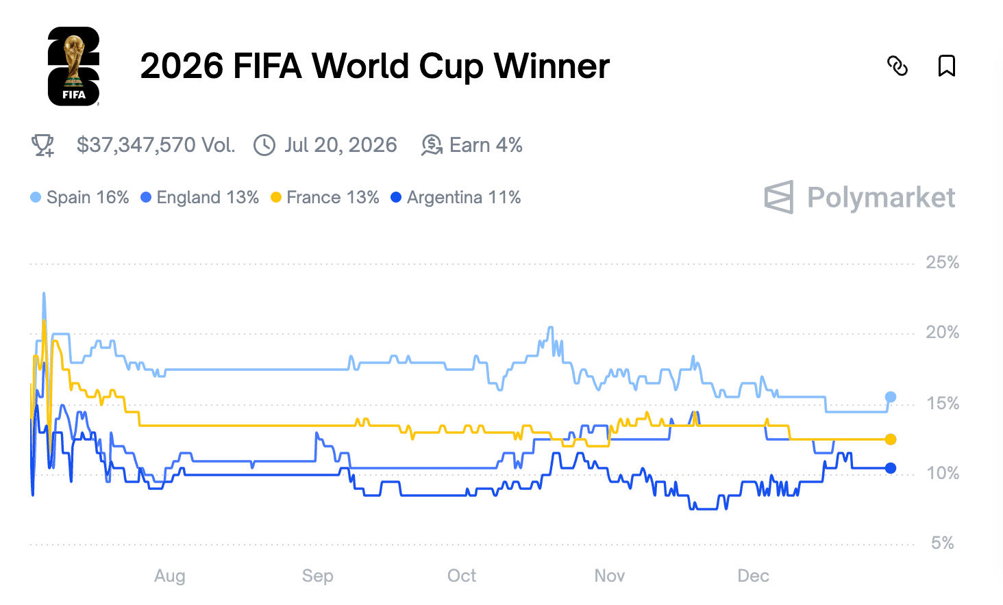 According to Polymarket, Spain is projected as the current favorite to win the World Cup with 16% odds, followed closely by England, France, and Argentina.