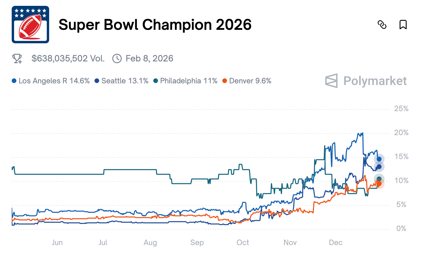 The Los Angeles Rams rank as the current favorite to win the Super Bowl among bettors on Polymarket, with a 14% chance, followed by the Seattle Seahawks, Philadelphia Eagles, and Denver Broncos.