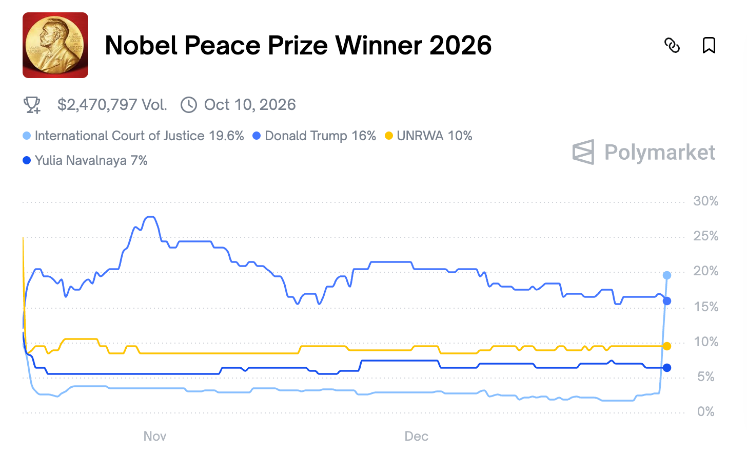 With a 19% chance, the International Court of Justice is the current rising favorite on Polymarket to receive the Nobel Peace Prize. U.S. President Donald Trump, The UNRWA (United Nations Relief and Works Agency for Palestine Refugees) and Russian political opposition leader Yulia Navalnaya are close behind.
