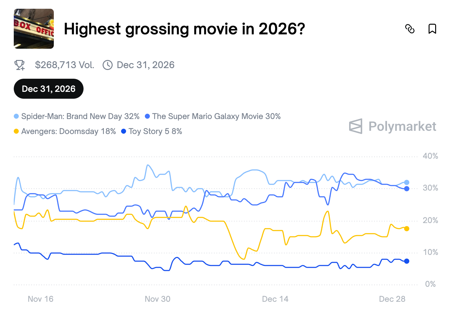 Spider-Man: Brand New Day is the current leader on Polymarket, with 32% odds that it will win the title of highest grossing movie in 2026. It remains in close contention with The Super Mario Galaxy Movie and Avengers: Doomsday.