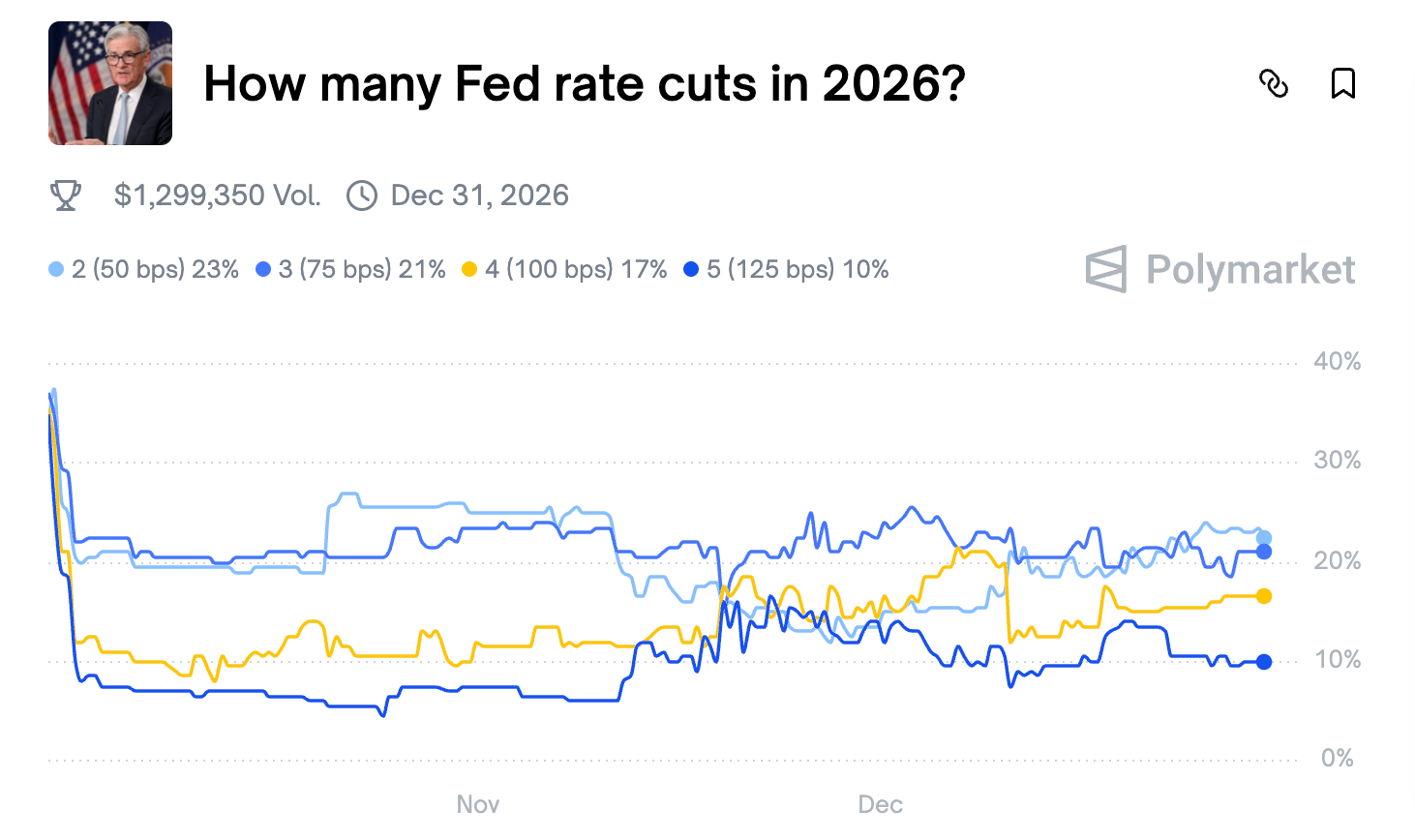 Today, the Fed is targeting overnight interest rates between 3.50% and 3.75%, but looking ahead to 2026, Polymarket bettors overwhelmingly expect further easing. The highest-probability outcome points to 0.50% in cumulative cuts, though 10% of the bettors still believe the Fed could slash rates by as much as 1.25%.