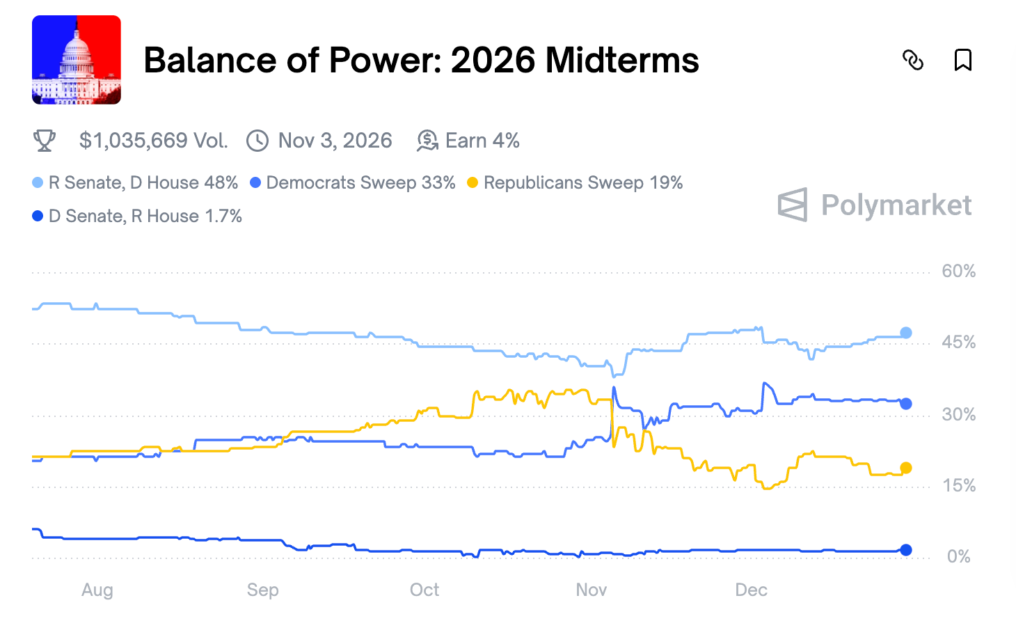 In 2026, it appears that Americans will seek out change from the current mono-party political regime. The odds of a Democrat sweep now lie at 33%, and markets are assigning a 48% chance that the party reclaims control of the House.