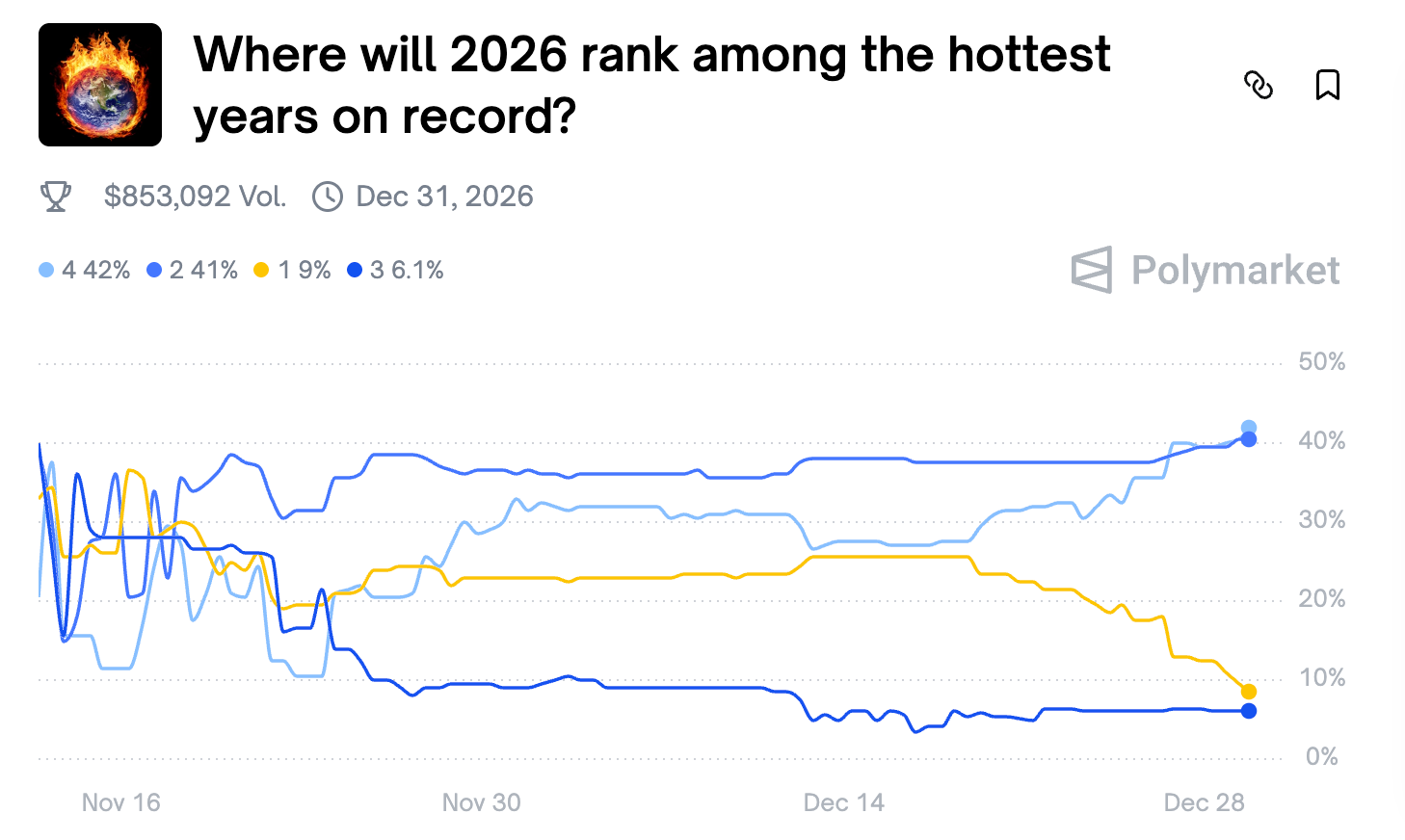 Polymarket speculators are bracing for even more extreme heat in 2026, assigning a 38% chance that it ranks as the fourth hottest year of all time and a 9% chance that it sets a new record, based on NASA’s Global Land–Ocean Temperature Index.