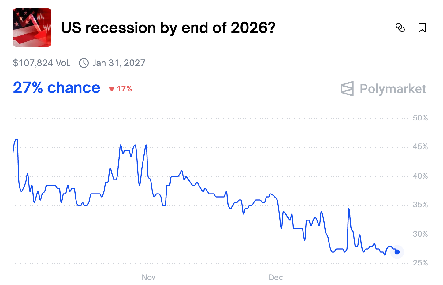For now, Polymarket speculators appear relatively optimistic, assigning just a 27% chance to a U.S. recession occurring in 2026.